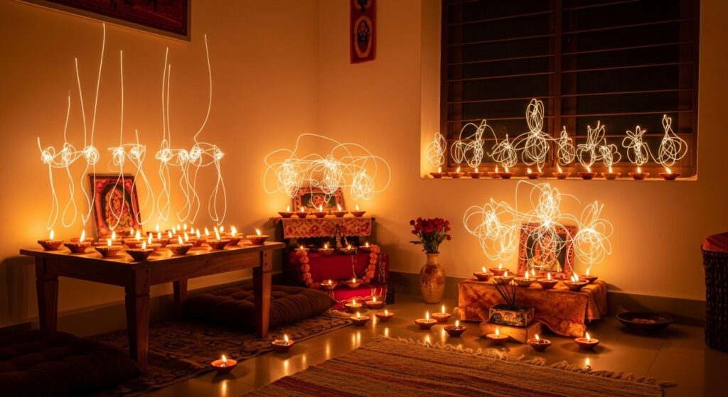 “Peaceful Indian home interior with diya lamp glowing, incense smoke, spiritual calm atmosphere, warm golden lighting, symbolizing positive energy and protection”